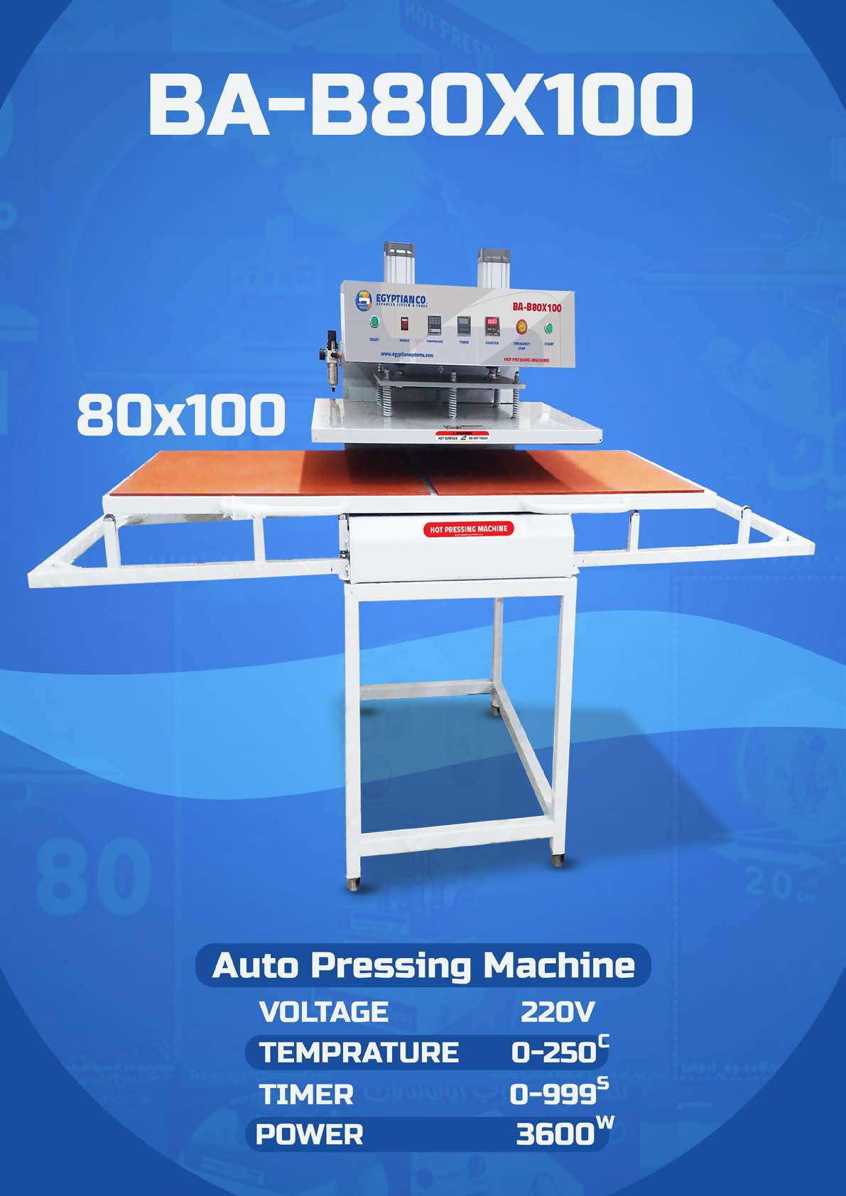 مكبس حراري عملاق ومخصص للإنتاج التجاري الضخم. يأتي بمساحة طباعة واسعة جدًا 80×100 سم مع قاعدتين متحركتين من الأسفل للسحب والإدخال بحرية أثناء التشغيل، مما يسمح بتحضير قطعة جديدة بينما الأخرى تحت الطباعة، لتوفير الوقت ومضاعفة الإنتاج.
